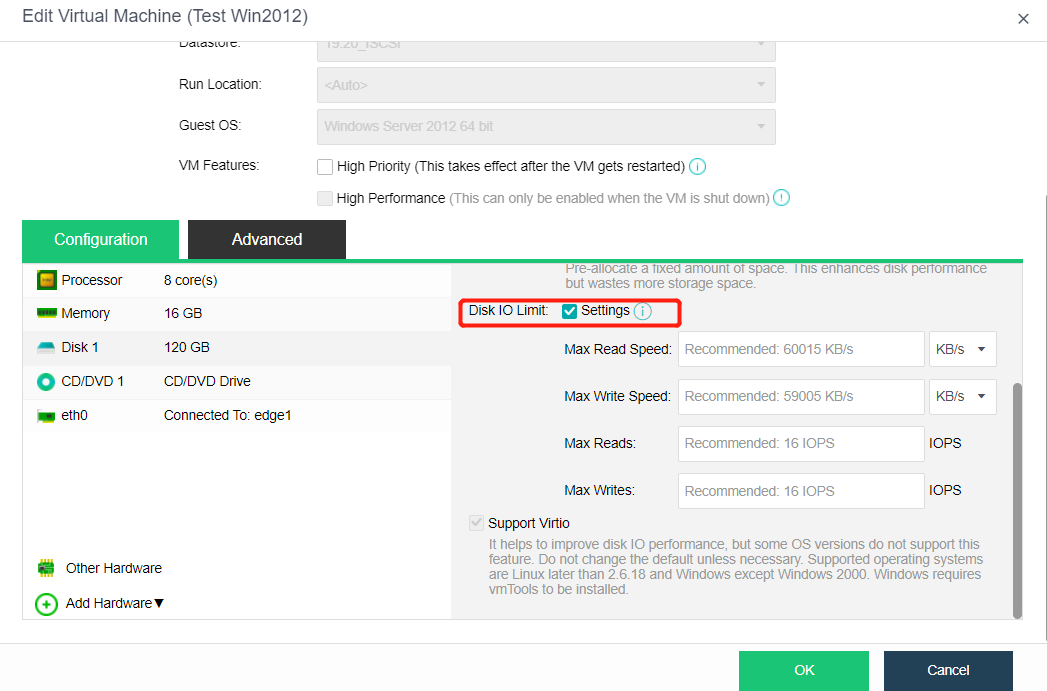 This section instructs the administrator to limit the upper limit of resources used by non-important virtual machines to ensure that important virtual machines have sufficient resources to use. Settings are also supported in the power-on state. The disk's maximum read/write speed and maximum read/write speed can be limited. When the virtual machine runs for one week, a recommended value will be generated and displayed in the input box. The maximum read/write speed range is 128KB/s-102400MB/s, and the maximum read/write times range is 16 to 2147483647.