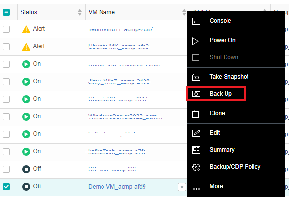 Navigate to Compute, move to the selected VM and click More >Back Up.