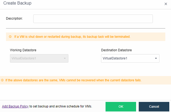 Enter the Create Backup page, input a custom description, and select the Destination Datastore.