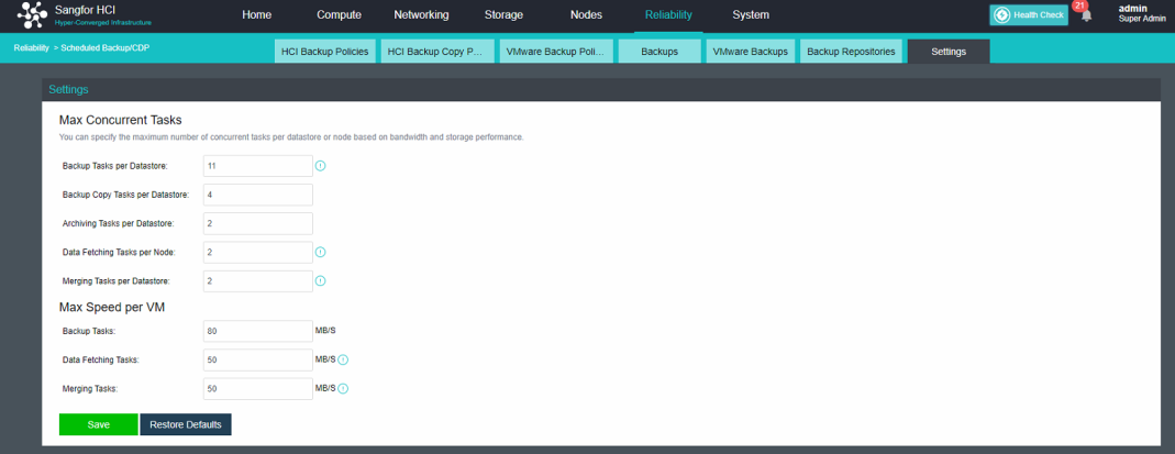 Backup merge speed limit: Enter the backup merge speed limit configuration page from the settings option in Reliability > Scheduled Backup/CDP > Settings.