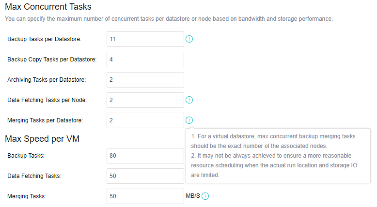 The maximum number of concurrent backup and merge speed limits can be configured to 16, and the maximum speed limit can be up to 300MB/S.