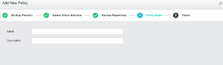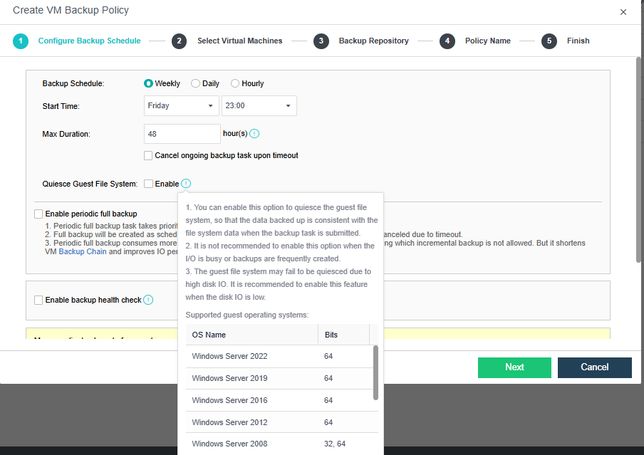 Select Scheduled for Type and click New Policy next to Backup Policy. On the backup policy settings page, set the backup frequency, date, and duration. Select Enable periodic full backup and enable Quiesce Guest File System as needed.