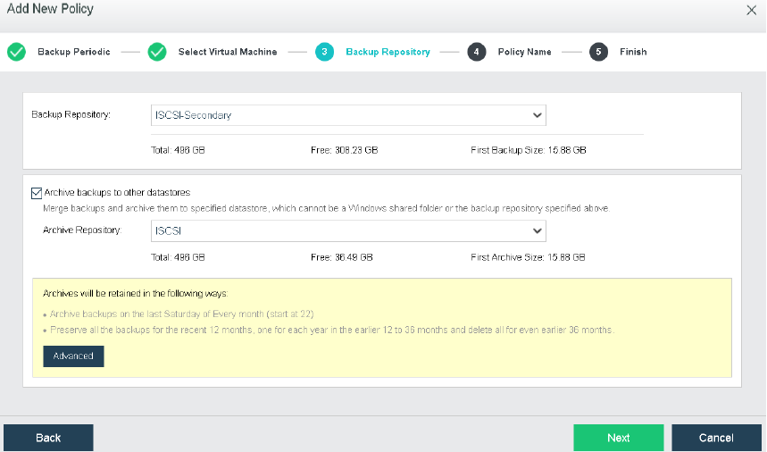 Guide administrators to configure automatic backup policies in the scenario of automatic virtual machine backup. The backup cleanup policy setting is more flexible, and the backup retention period can be set up to 100 years. Supports setting up regular full backups on a monthly basis. Supports automatic archiving of backup files to secondary storage and restores virtual machines from archived files.