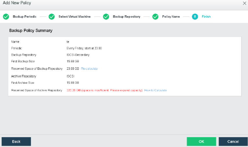 Confirm the configuration of the backup policy. If there is an error, you can go back and click Previous to modify it step by step. After confirming there is no problem, click OK to make the scheduled backup policy take effect.