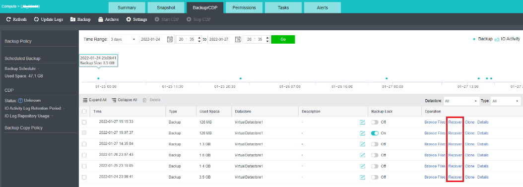 Click Backup/CDP to find the backup file point of the virtual machine. Then, click Browse File of the selected Time.