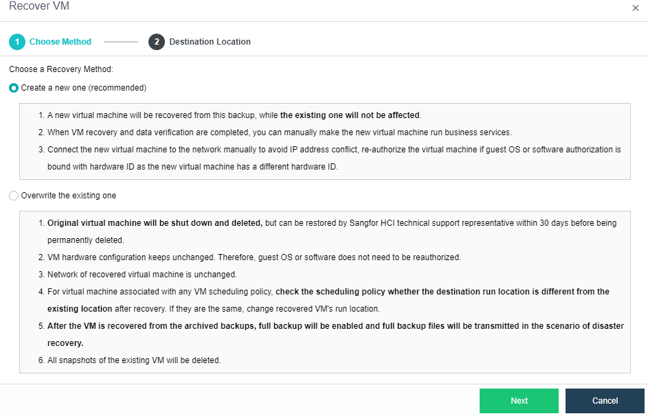Click Recover to restore the corresponding backup file. You can choose to Create a new one or Overwrite the existing one to restore.
