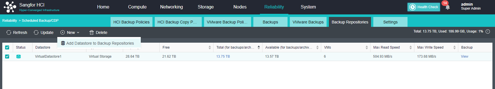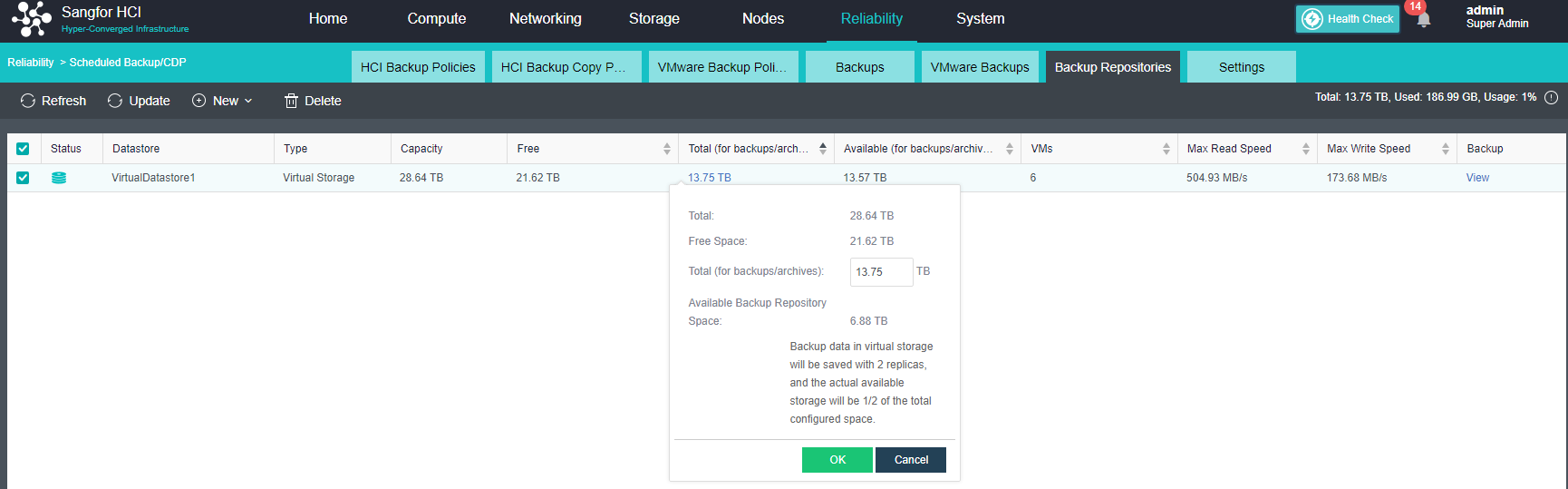The backup repositories refer to the backup repository system that stores the current virtual machine files. It is recommended to use aSAN distributed storage for the backup repositories. Still, you need to specify the used capacity space so that the distributed storage can manage it in isolation. Click the backup space with the mouse to set the backup space. Storage media can be added to the backup resource pool.