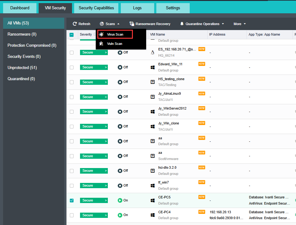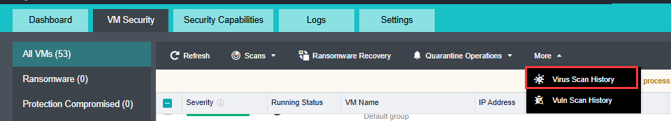 On the VM Security page, select the target VM and select Virus Scan from the Scans drop-down list.