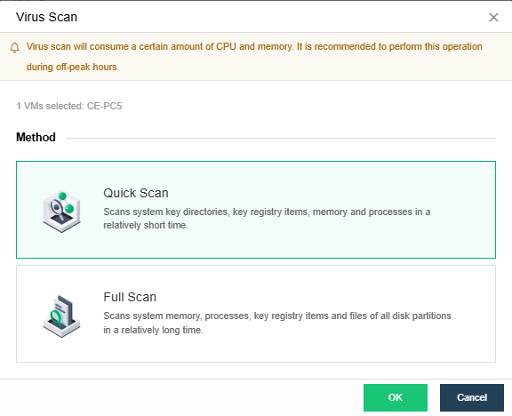 • Quick Scan: Scans critical system directories and registry items, memory, and running system processes, which takes a short period of time.