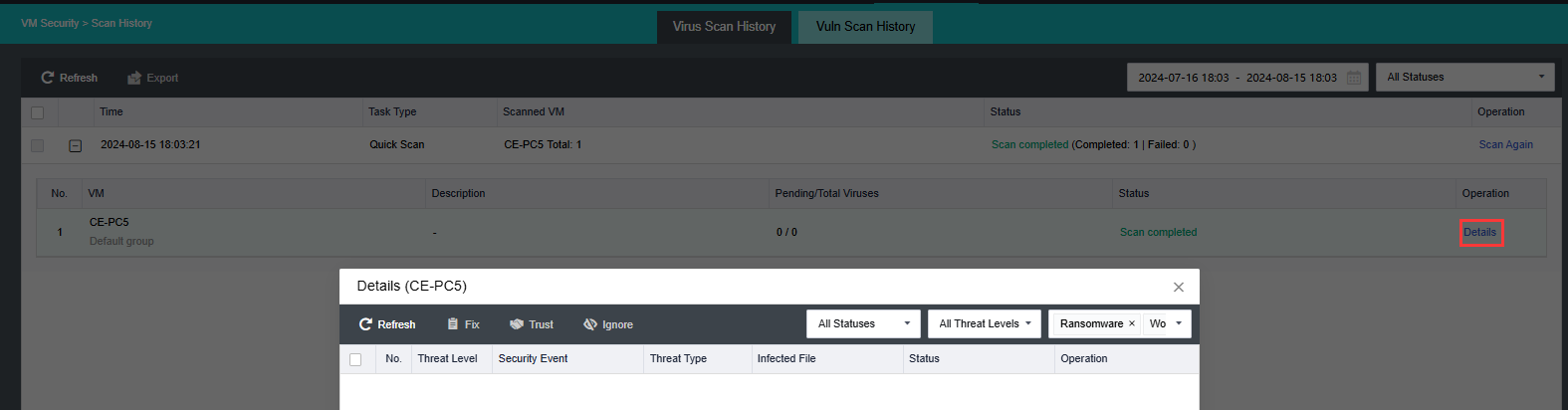 On the page that is displayed, click Details in the Operation column of the VM and choose to fix, trust, recover, untrust, or ignore the security event.