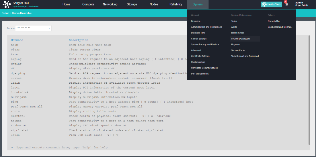 Perform simple command-line operations through the web page, view basic information about the network and background, and simplify the troubleshooting process. The interface lists the commands supported by the HCI console and the functions of the commands.