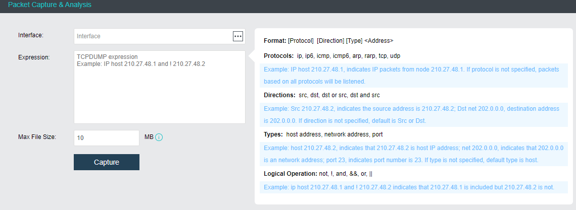 • Condition: Configure the packet capture conditions. The conditional format supports Protocols, Direction, Type (address), and Logical Operation.
