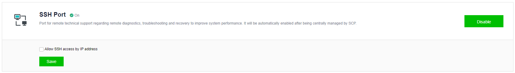 On this page, you can enable and disable the SSH port at the same time. It is also possible to restrict the IP addresses that can access the SSH port by enabling SSH IP Restriction.