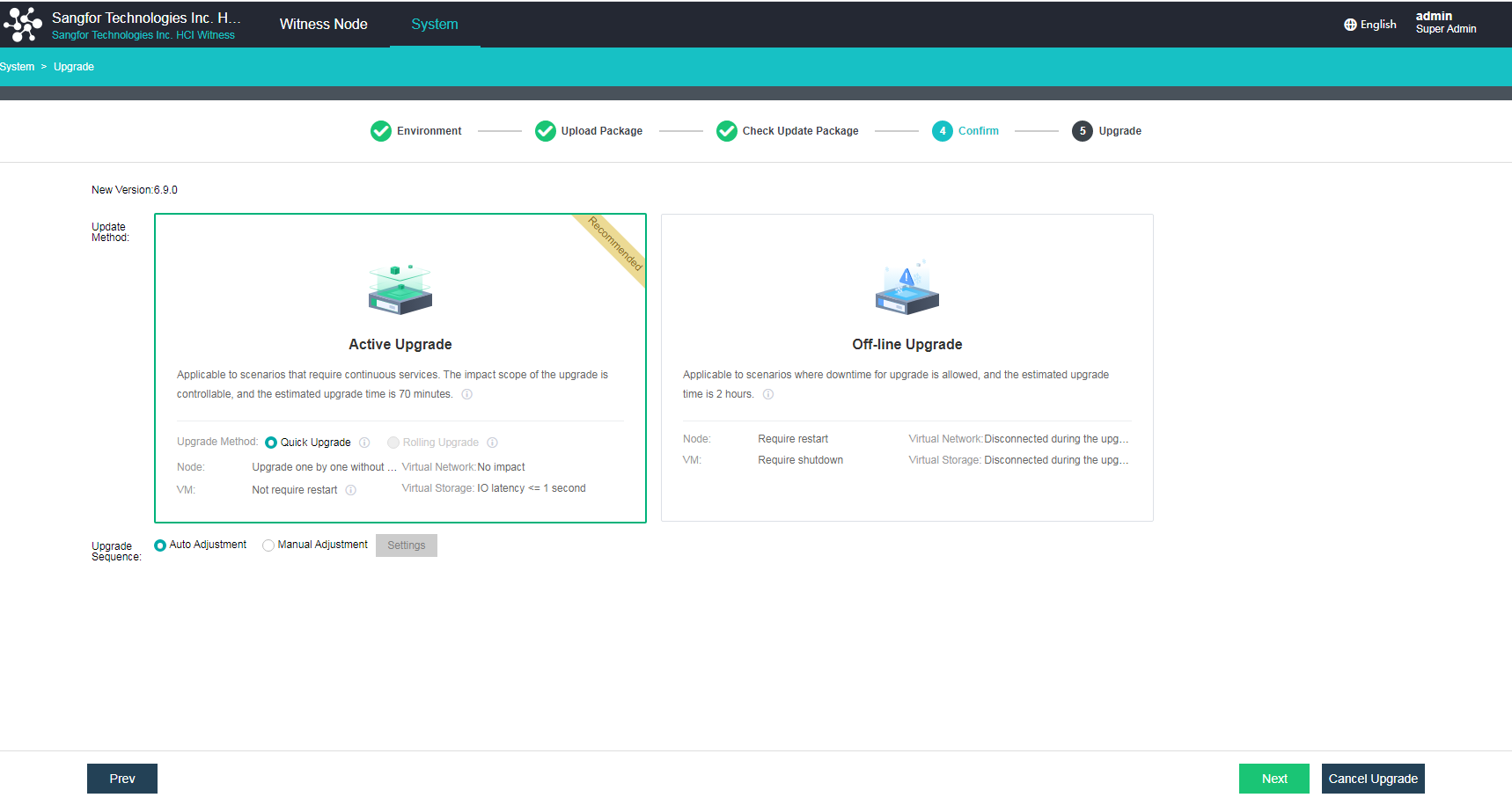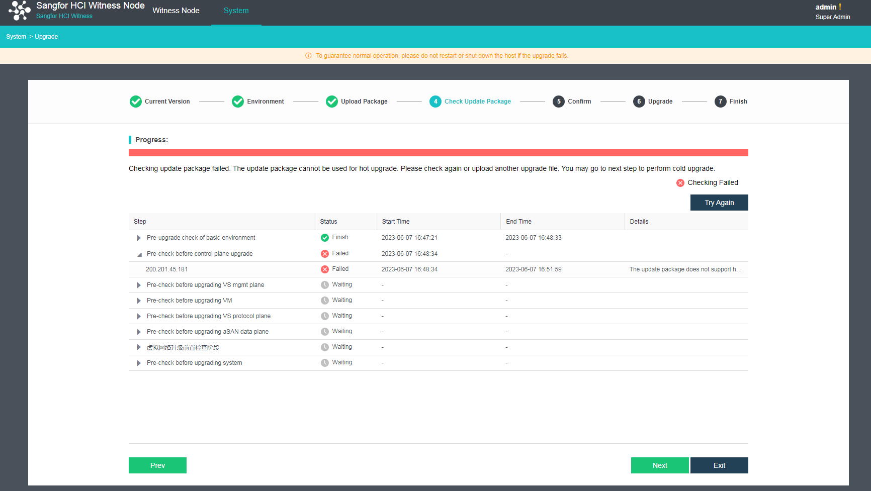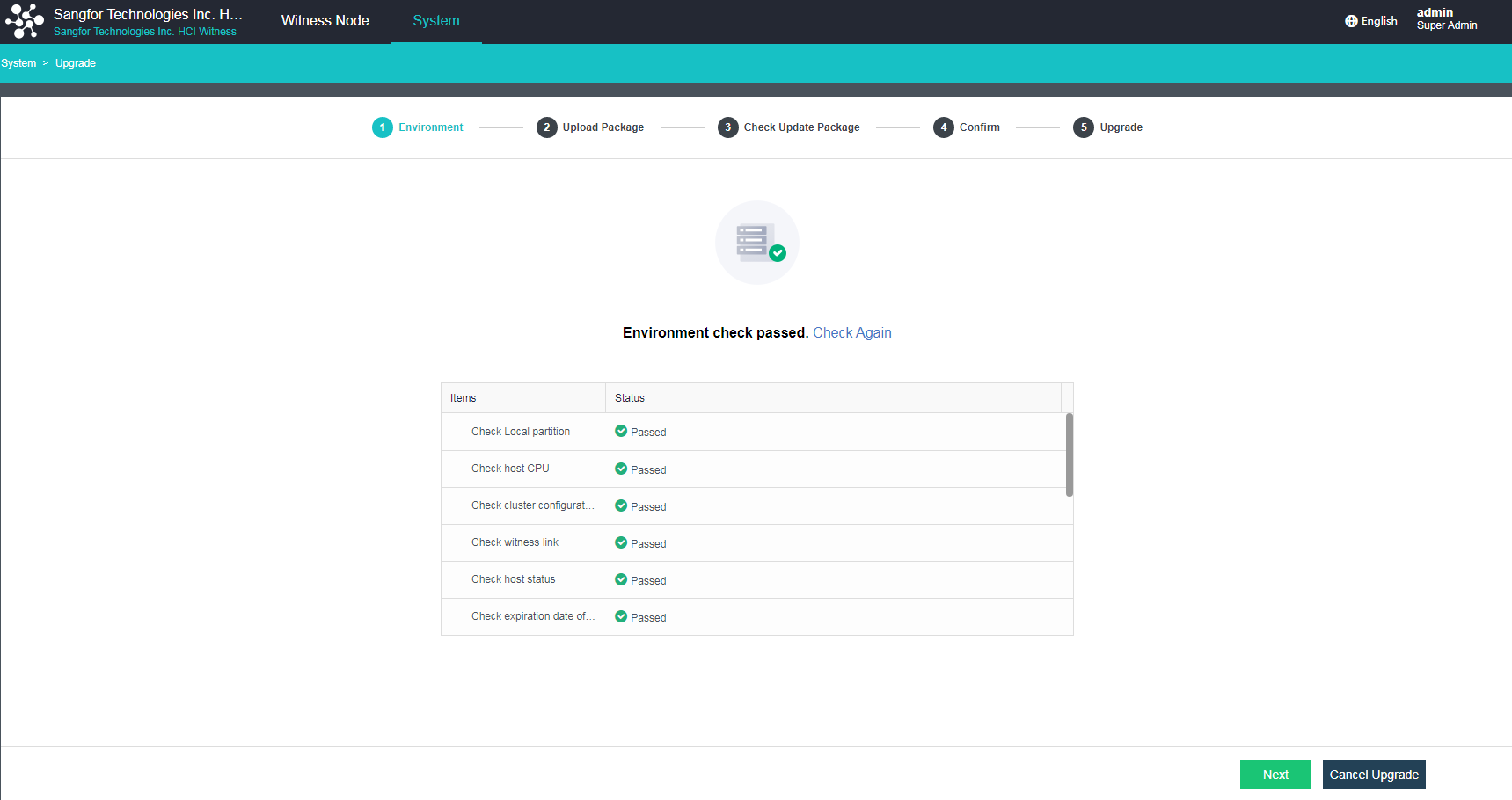 Check the update package. (If the current version does not support the active upgrade using the update package, click Next to perform an offline upgrade. If the active upgrade is supported, please wait until all checking steps are finished before the upgrade. If any step fails, fix the issues first.)