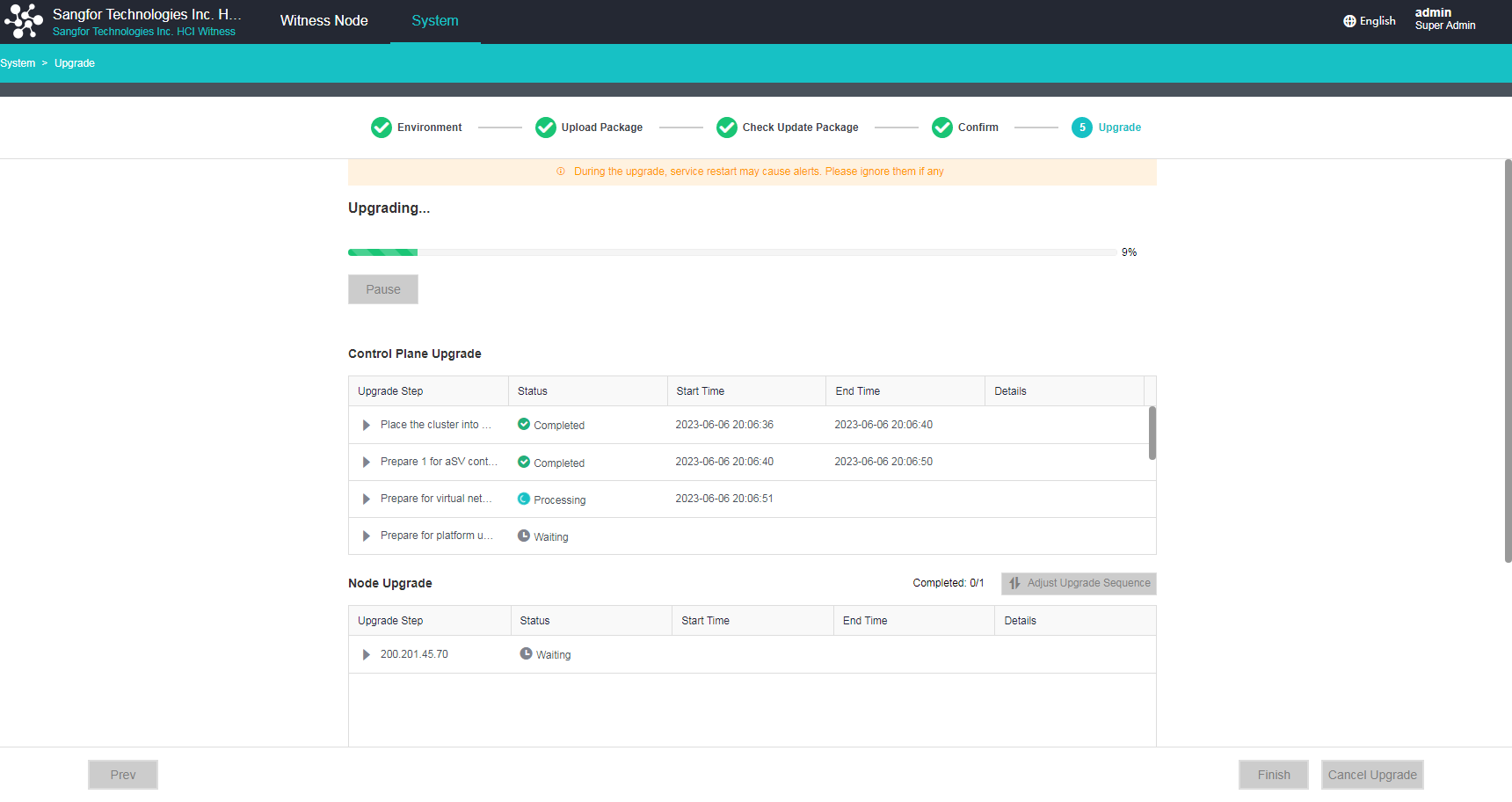 The witness node will enter cluster upgrade mode during the upgrade, and the cluster environment check will be performed.