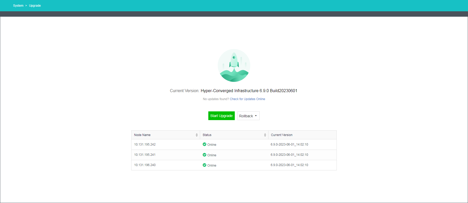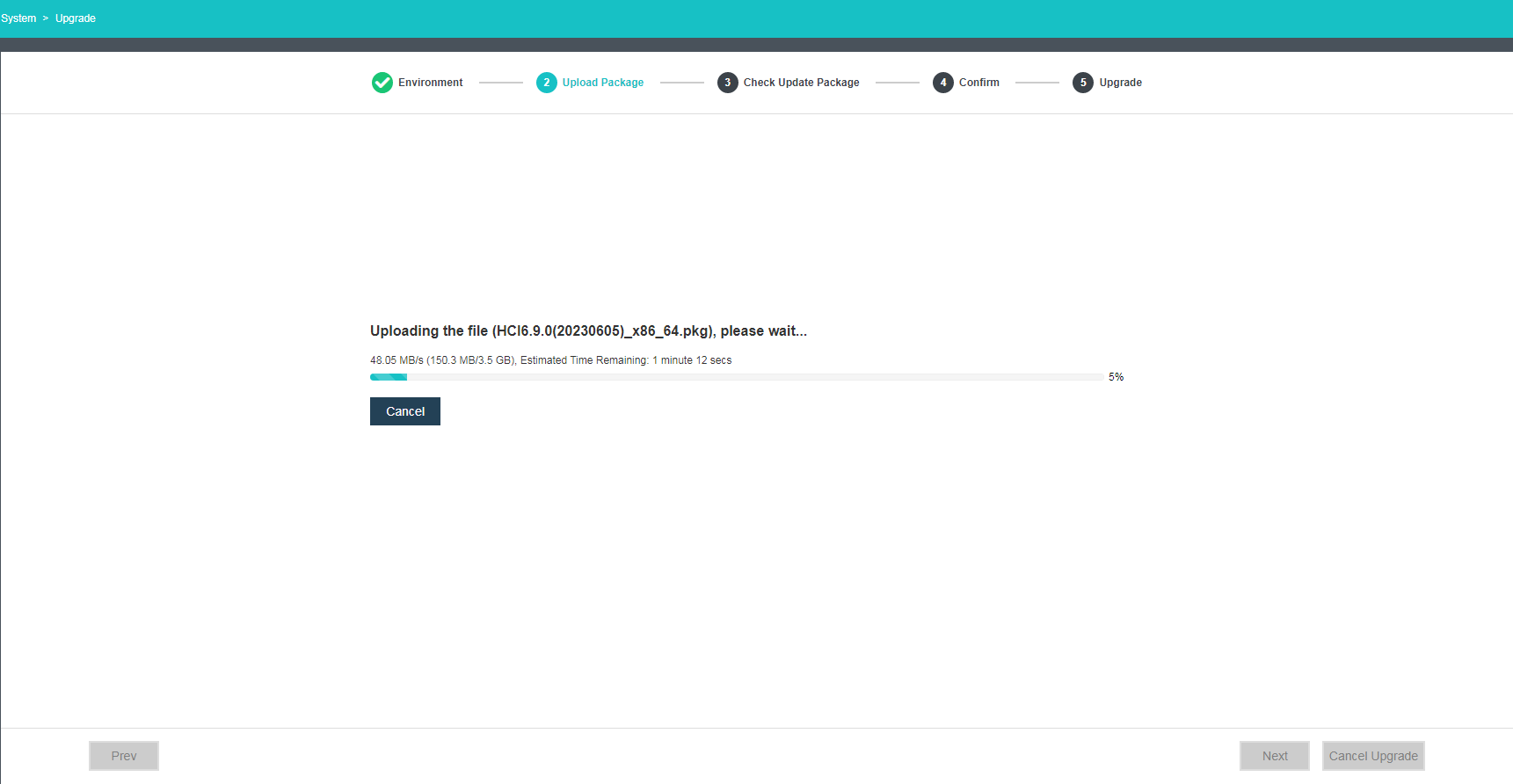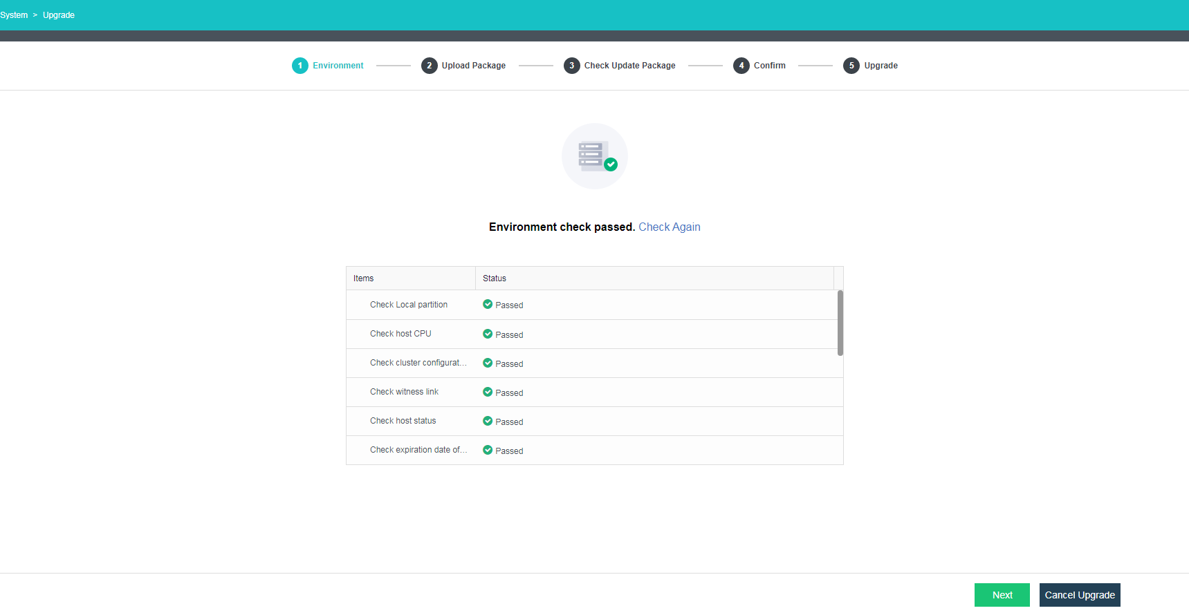 Use aDeploy to perform the pre-upgrade check and install the pre-upgrade check package (seeChapter 2.4.3 HCI Pre-Upgrade Check), then go to System > Upgrade and click Start Upgrade. The cluster will enter Maintenance Mode and run the environment check.