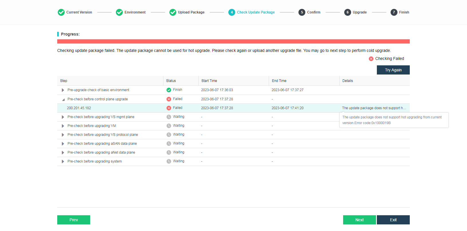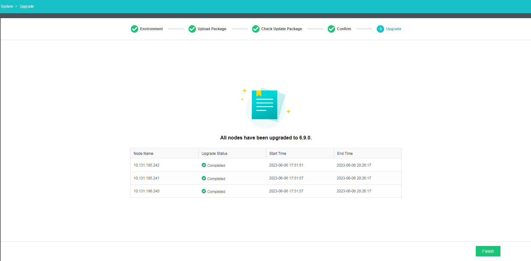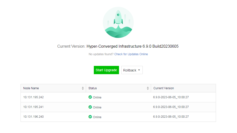 Use aDeploy to perform the pre-upgrade check and install the pre-upgrade check package (seeChapter 2.4.3 HCI Pre-Upgrade Check), then go to System > Upgrade and click Start Upgrade. The cluster will enter Maintenance Mode and run the environment check.
