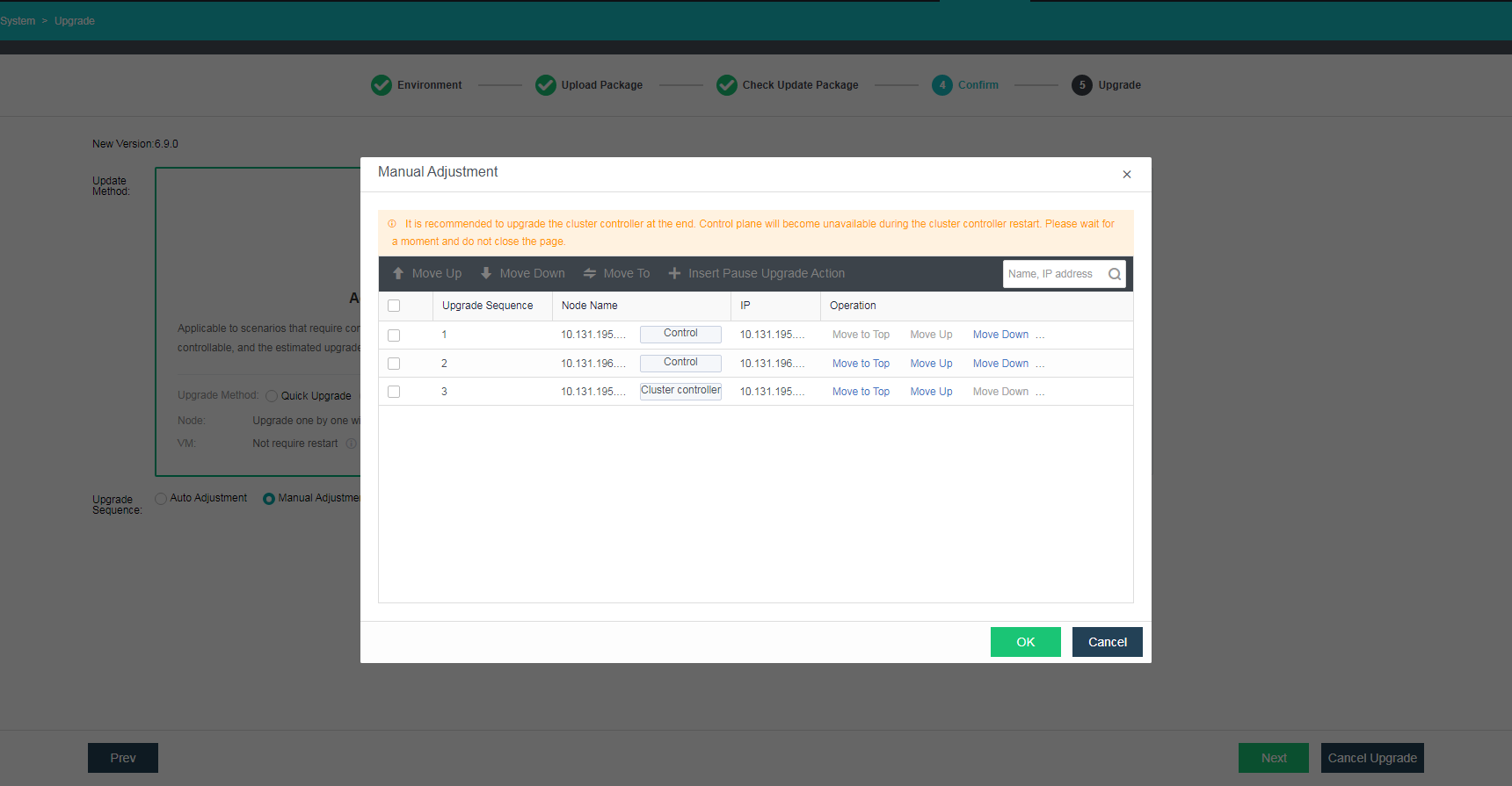 Select Manual Adjustment for Upgrade Sequence to adjust the sequence of nodes for the upgrade, or select Auto Adjustment. After the upgrade sequence adjustment is complete, click Next.