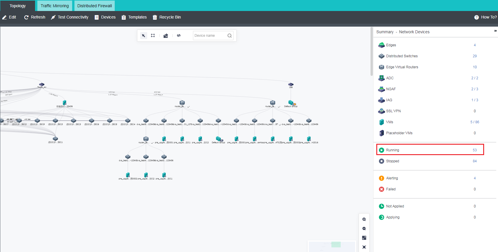 Go to Networking > Topology, click Running to view all NFV devices (excluding routers and switches), and shut them down.