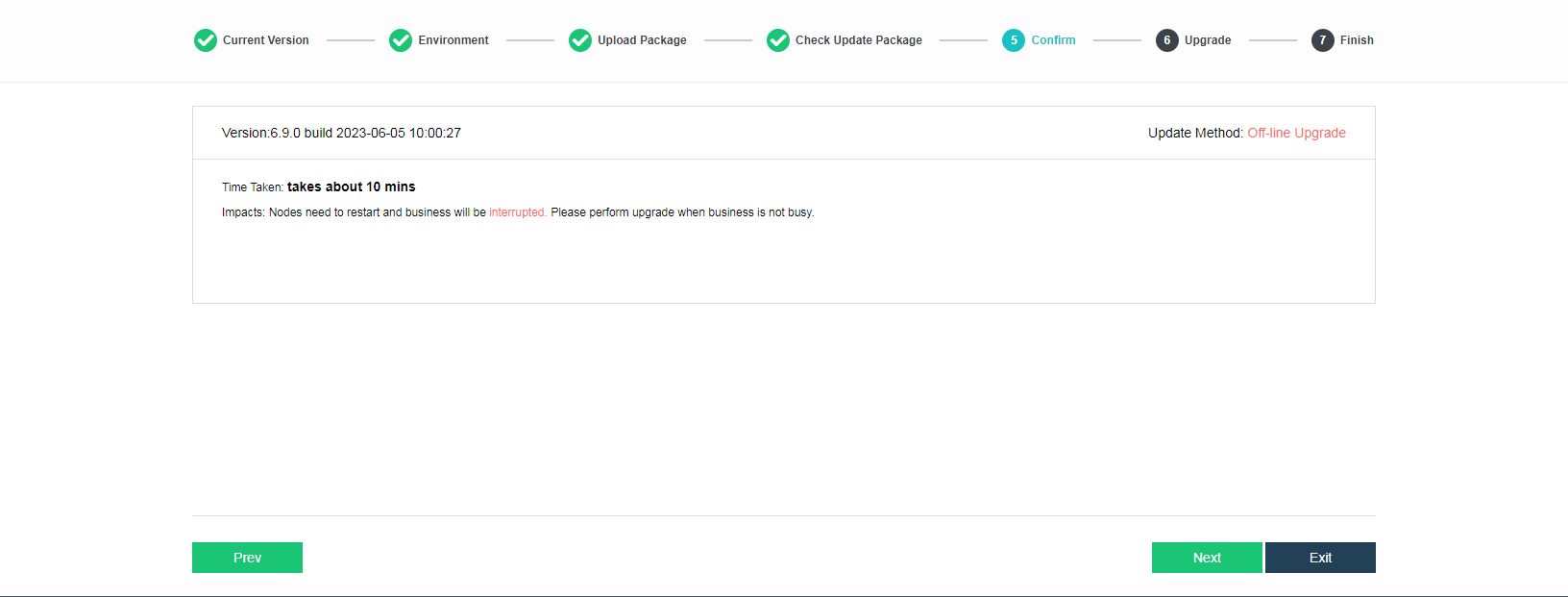 Run the pre-check, and the system advises to perform an offline upgrade. Click Next to proceed.